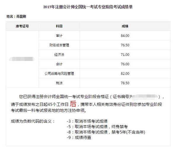 2017年注冊會計師考試成績截圖: