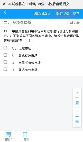 為了應(yīng)對突發(fā)情況,在答題過程中添加了“保存退出”選項,考試可以及時退出方便繼續(xù)做答。