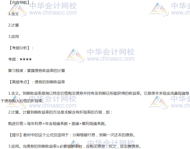 備考時間緊張,抓緊時間抓住重點備考注冊會計師吧!正保會計網校教學老師為廣大考生整理了高頻考點, 我們一起來學習2018《財務成本管理》高頻考點:債券的到期收益率。本考點屬于《財務成本管理》第六章債券、股票價值評估第一節債券價值評估的內容。