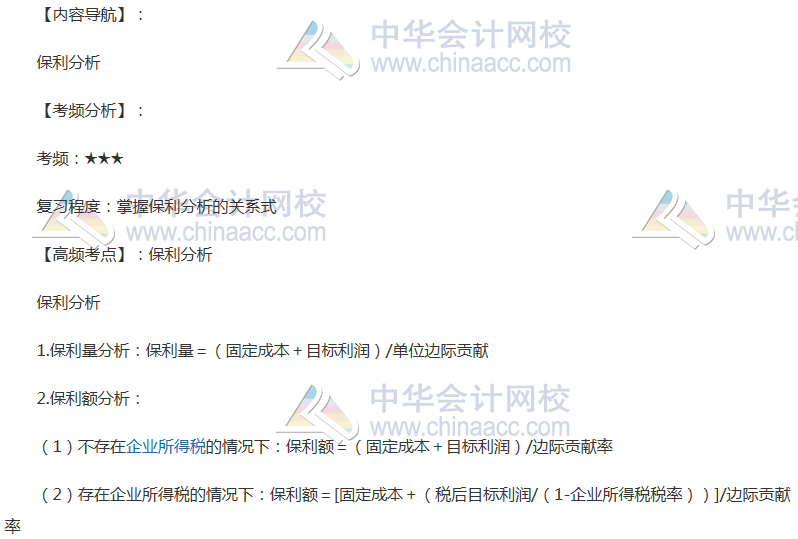 備考時間緊張,抓緊時間抓住重點備考注冊會計師吧!正保會計網校教學老師為廣大考生整理了高頻考點,我們一起來學習2018年《財務成本管理》高頻考點:保利分析。本考點屬于《財務成本管理》第十六章本量利分析第三節保利分析的內容。
