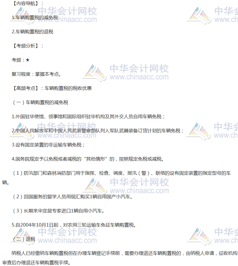 備考時間緊張,抓緊時間抓住重點備考注冊會計師吧!正保會計網校教學老師為廣大考生整理了高頻考點,我們一起來學習2018年《稅法》高頻考點:車輛購置稅的稅收優惠。本考點屬于《稅法》第十一章車輛購置稅法、車船稅法和印花稅法第一節車輛購置稅法的內容。