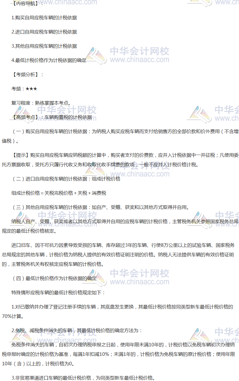 備考時間緊張,抓緊時間抓住重點備考注冊會計師吧!正保會計網校教學老師為廣大考生整理了高頻考點,我們一起來學習2018年《稅法》高頻考點:車輛購置稅的計稅依據。本考點屬于《稅法》第十一章車輛購置稅法、車船稅法和印花稅法第一節車輛購置稅法的內容。