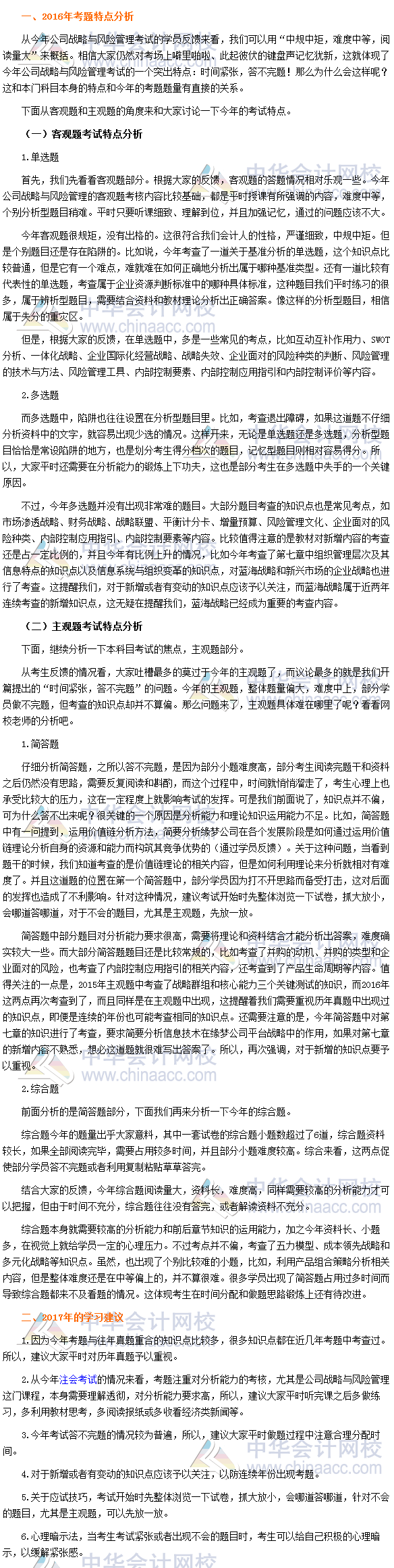 2016年注會《公司戰(zhàn)略與風(fēng)險管理》考試已經(jīng)落下帷幕,正保會計網(wǎng)校網(wǎng)校教學(xué)專家這幾天通過網(wǎng)絡(luò)搜集了很多考試信息,并且對比往年的試題做了深入的分析,得出以下幾點(diǎn)結(jié)論,供大家參考: