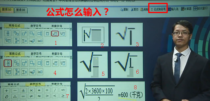 聽說公式輸入很難,應該怎么輸入公式呀?點擊機考界面的公式與符號按鈕就會彈出1,然后按照1~7的順序進行操作,就能成功的出現8的效果。不信你可以自己試試~