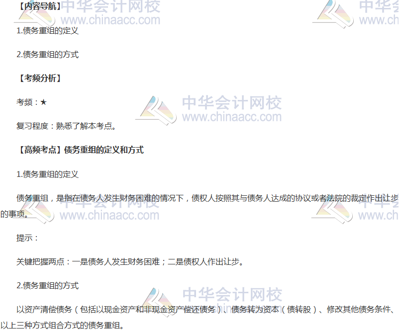 備考時間緊張,抓緊時間抓住重點備考注冊會計師吧!正保會計網校教學老師為廣大考生整理了高頻考點,我們一起來學習2018《會計》高頻考點:債務重組的定義和方式。本考點屬于《會計》第十九章債務重組第一節債務重組的定義和重組方式的內容。