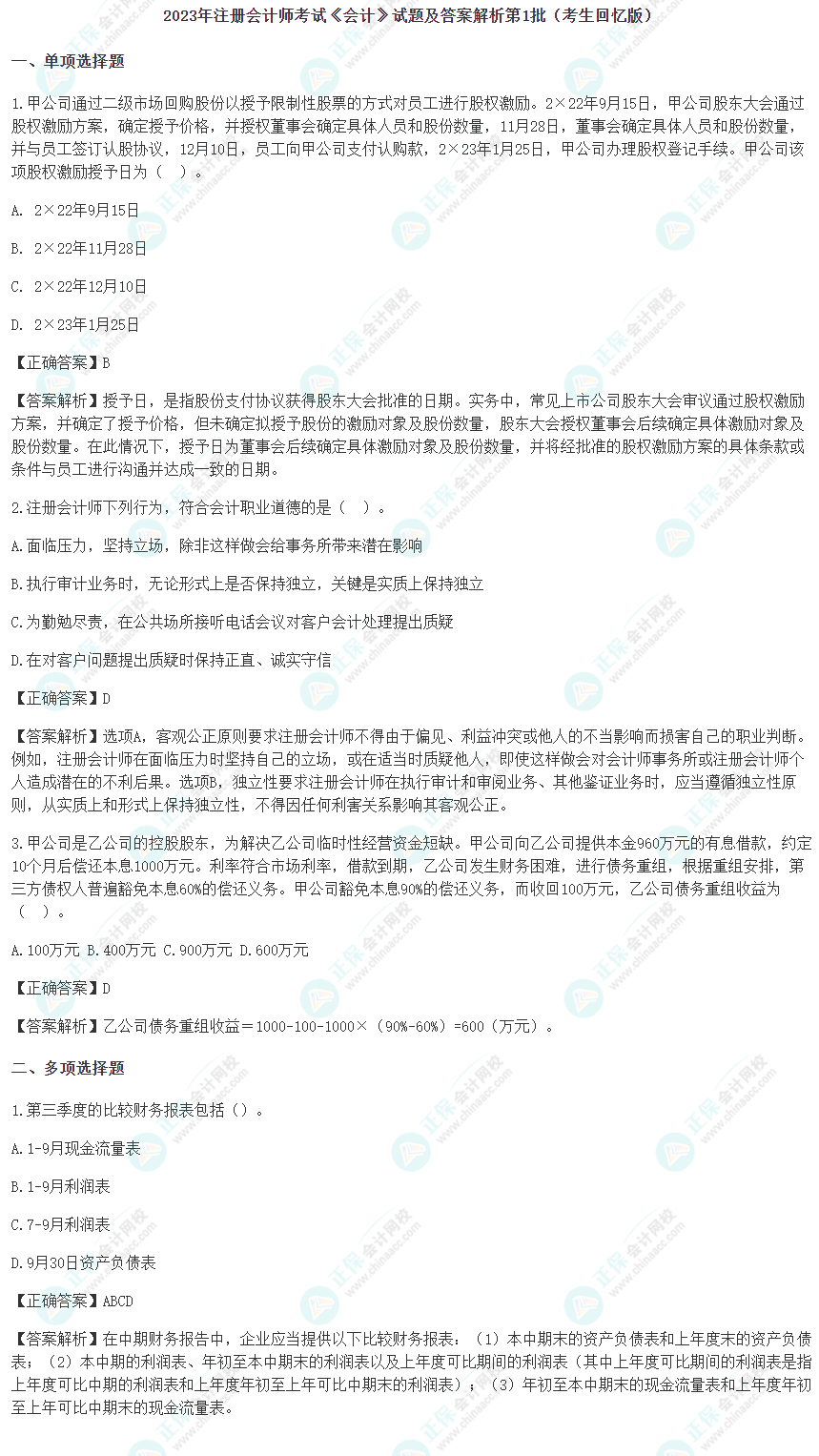 2023年注冊會計師《會計》第一場考試已經(jīng)結(jié)束,大家都考得怎么樣呢?正保會計網(wǎng)校根據(jù)注會考生反饋,整理了2023年注冊會計師《會計》第一場考試試題及參考答案(考生回憶版),供考生參考!快來一起看看吧~