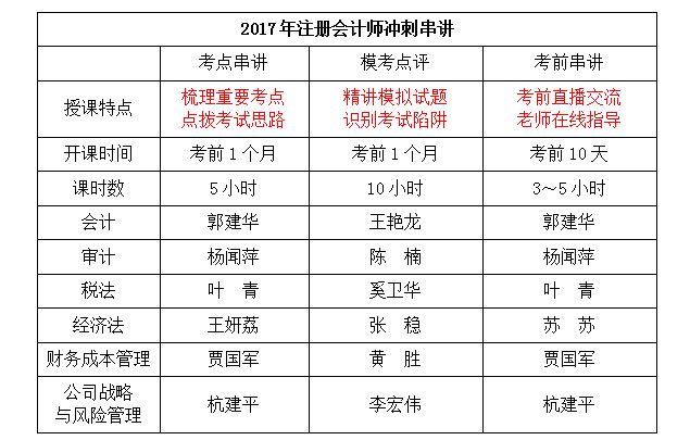 2017年注冊會計師考試沖刺串講課程已經開通啦!抓住僅剩一個月的備考時間,從各章節重要考點難點到考前系統性的模擬試題再到考前十天的老師直播,全方位的沖刺串講學習助力2017年CPA考試。