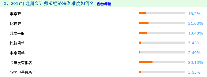 本次調查參與人數共計2655人,調查顯示,16.2%的考生認為試題非常難,21.63%的考生認為試題比較難,18.48%的考生認為考試難度一般,5.43%的考生認為試題比較簡單,2.49%的考生認為試題非常簡單。對比去年的調查結果可知,2017年注會《經濟法》考試難度有所上升,主要是因為考察知識點比較偏,因此不少考生失利。