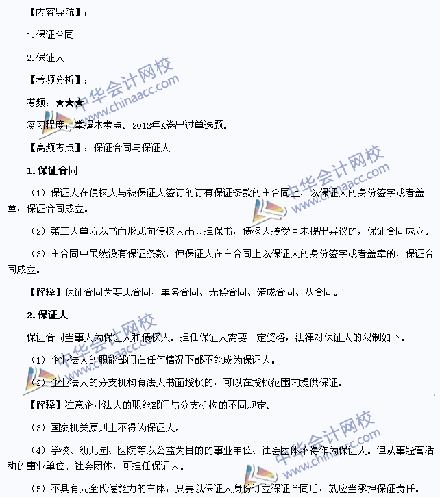 2013注冊會計師考試《經濟法》高頻考點:保證合同與保證人