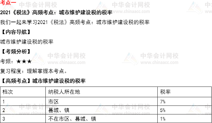 我們一起來學習2021年《稅法》高頻考點:城市維護建設稅的稅率。本考點屬于《稅法》第六章城市維護建設稅法和煙葉稅法的內容。