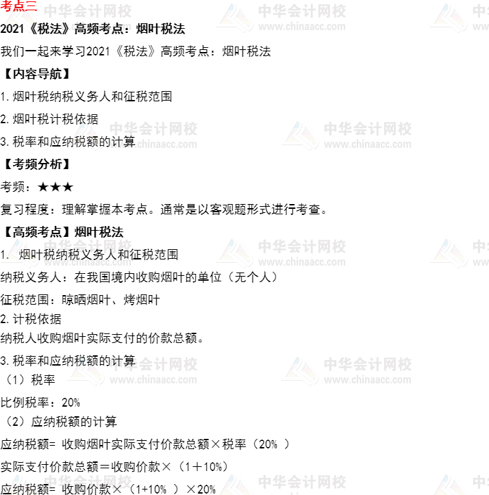 我們一起來學習2021年《稅法》高頻考點:煙葉稅法。本考點屬于《稅法》第六章城市維護建設稅法和煙葉稅法的內容。