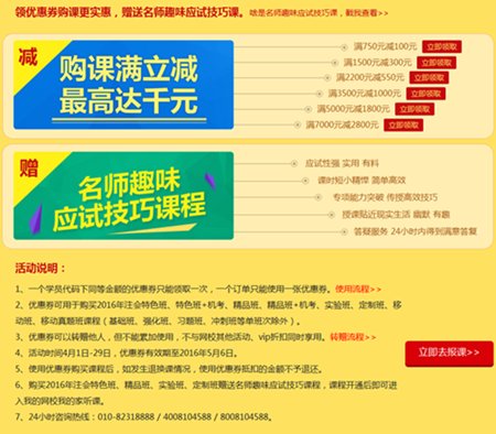 答:領取優惠券(每個優惠券都可以領取一次哦?。┲簏c擊活動頁面的“立即購買”按鈕,即可跳轉到選課中心。