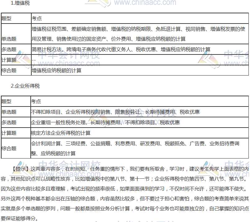 降龍十八掌雖然招式多,但是威力極大,在考試中這就跟咱們的增值稅和企業所得稅一樣,雖然這兩個稅種在教材的內容很多,但是考查的內容比較直接,分值占據考試“半壁江山”,若把這兩個稅種學好,便可以“獨領風騷”,成為武林中的佼佼者。但教材那么多內容,我們該如何下手呢?下面表格的內容是近幾年考查過的知識點,建議先從這些知識點中下手。