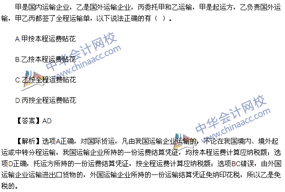 【點評】本題考核印花稅中國際貨運計稅依據的特殊規定。在網校葉青老師、楊軍老師考點串講班中有所提及。