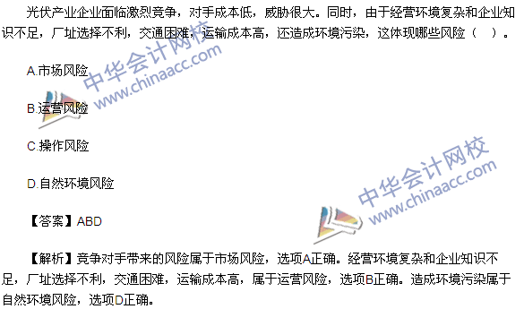 【點(diǎn)評(píng)】本題考核“企業(yè)面對(duì)的風(fēng)險(xiǎn)種類”的知識(shí)點(diǎn),該知識(shí)點(diǎn)在正保會(huì)計(jì)網(wǎng)校(www.sgjweuf.cn)2015年注冊(cè)會(huì)計(jì)師《公司戰(zhàn)略與風(fēng)險(xiǎn)管理》課程實(shí)驗(yàn)班模擬試題一綜合題、模擬試題二多選第9題中涉及。另外2015年夢(mèng)想成真系列叢書《應(yīng)試指南·注會(huì)戰(zhàn)略》215頁32題、216頁34題涉及該知識(shí)點(diǎn)。