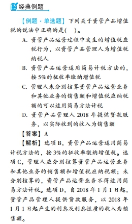 【點評】本題考核“資管產品增值稅的征收管理”這個知識點。該題目所涉及知識點在下列正保會計網校(www.sgjweuf.cn)2021年稅務師考試輔導《稅法(一)》中均有體現:葉青老師【高效實驗班】基礎精講第2章第2講、第2章第16講;劉丹老師【尊享無憂班】基礎精講第2章第24講;劉丹老師【高效實驗班】基礎精講第2章第24講;歐理平老師【高效實驗班】基礎精講第2章第27講;歐理平老師【超值精品班】基礎精講第2章第27講;葛瑞老師【高效實驗班】基礎精講第2章第19講;葛瑞老師【考前刷題集訓班】精華考點第2章第3講;劉丹老師《稅法(Ⅰ)應試指南》第79頁表2-63;《稅法(Ⅰ)經典題解(題解卷)》第73頁例題;《稅法(Ⅰ)經典題解(習題卷)》第20頁多選第25題。