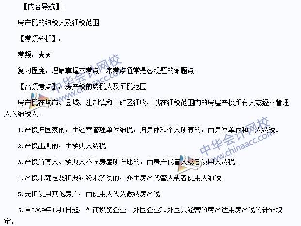 注稅考試《稅務代理實務》高頻考點:房產稅的納稅人及征稅范圍