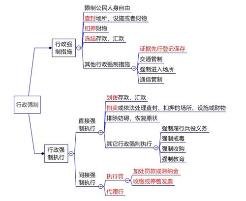 1.概念:行政機關在特定情形下依法對當事人的人身、財產暫時予以限制、控制,或者以一定方式強制當事人履行行政決定所確定義務的行為。——可訴性的具體行政行為