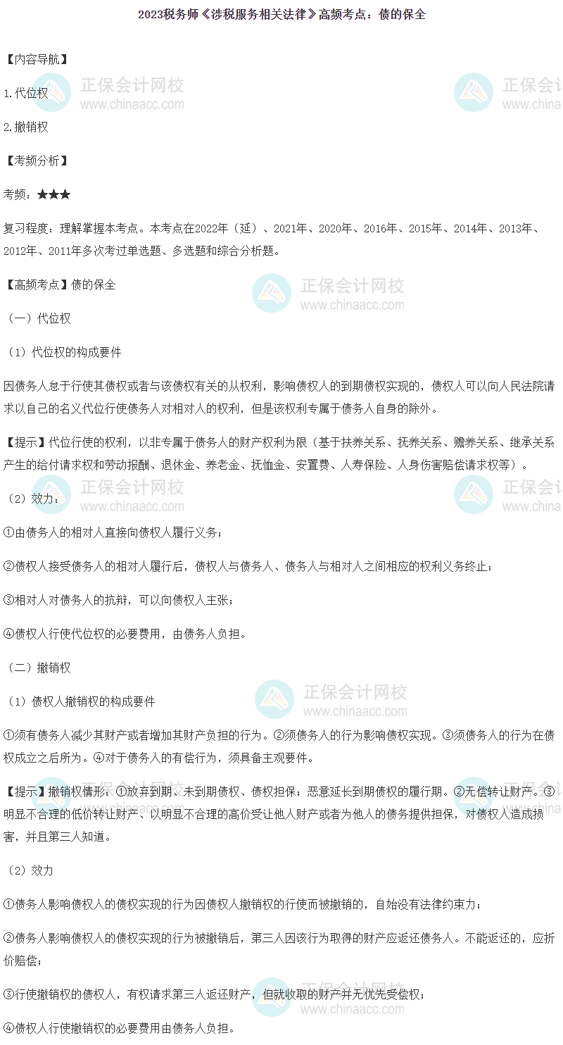 2023稅務師考試《法律》第九章高頻考點:債的保全