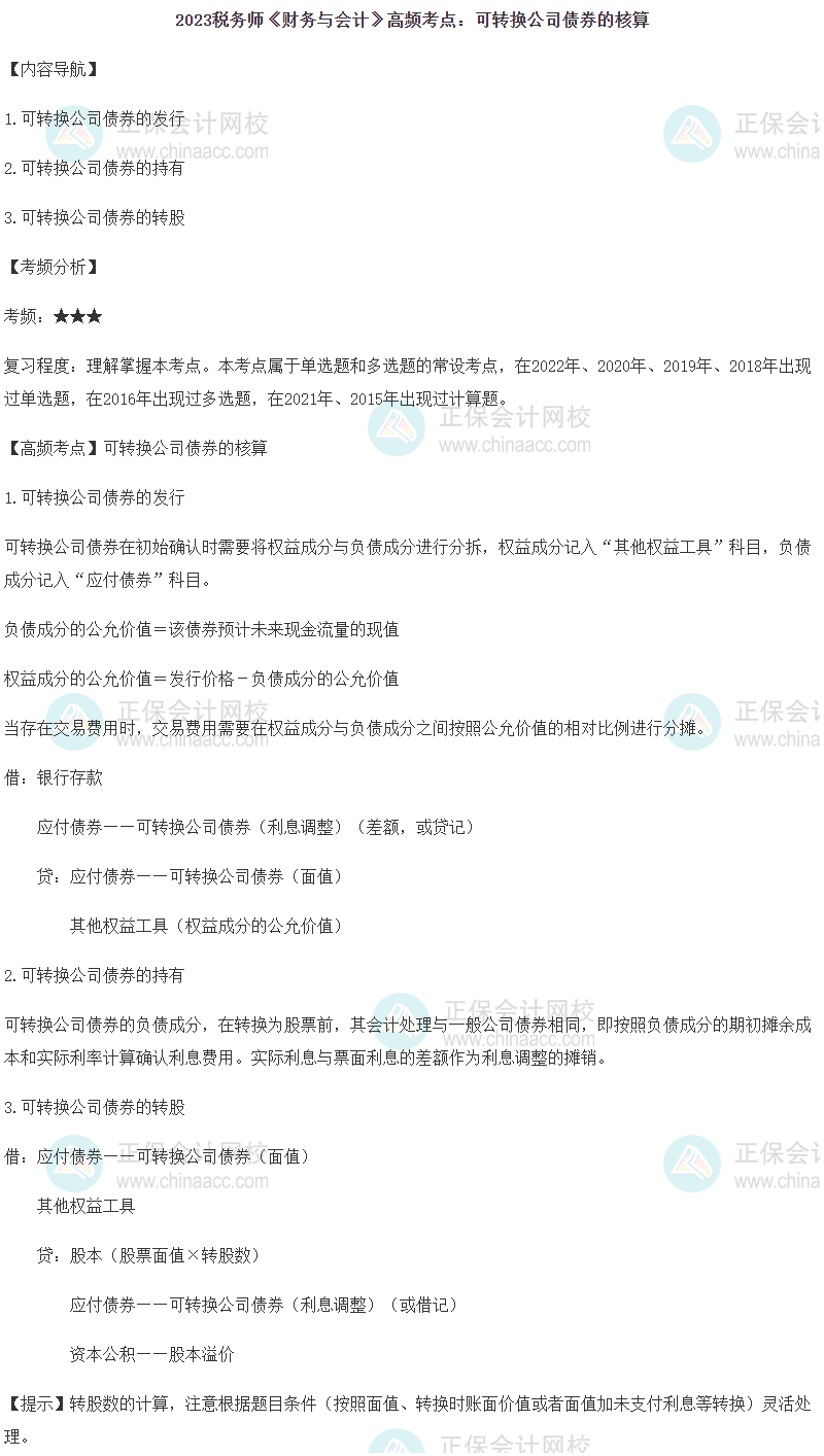 2023年稅務師備考正在進行中,網校為各位考生整理了2023年稅務師考試《財務與會計》第十三章的高頻考點——可轉換公司債券的核算,正在復習的同學快來查收!