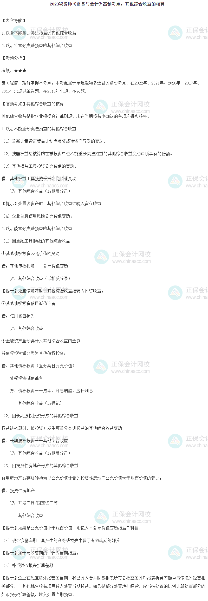 2023年稅務師備考正在進行中,網校為各位考生整理了2023年稅務師考試《財務與會計》第十四章的高頻考點——其他綜合收益的核算,正在復習的同學快來查收!