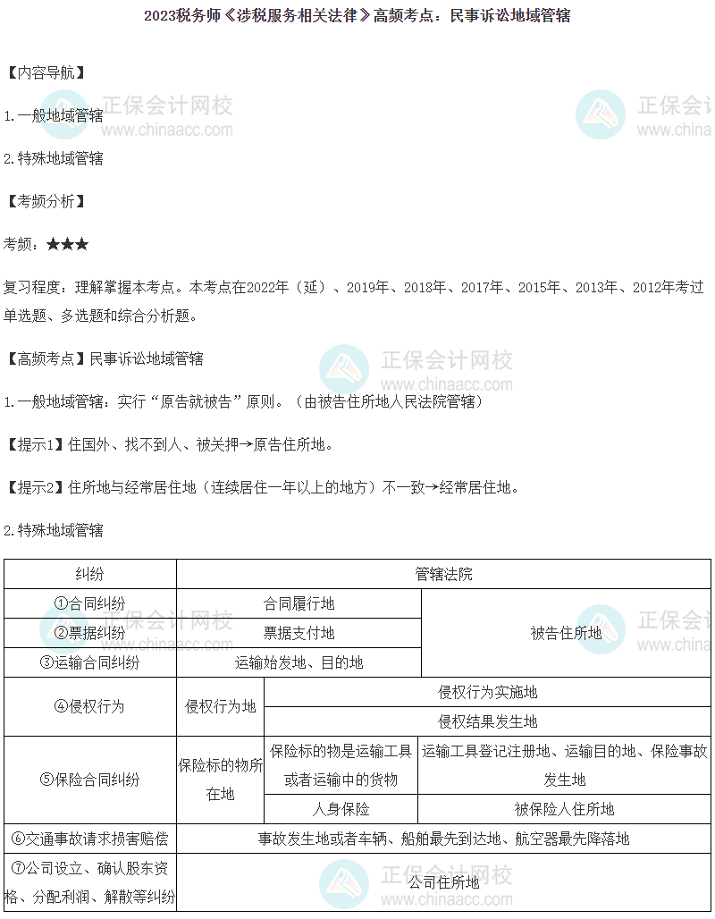 2023年稅務師備考正在進行中,網校為各位考生整理了2023年稅務師考試《涉稅服務相關法律》第十七章的高頻考點——民事訴訟地域管轄,正在復習的同學快來查收!