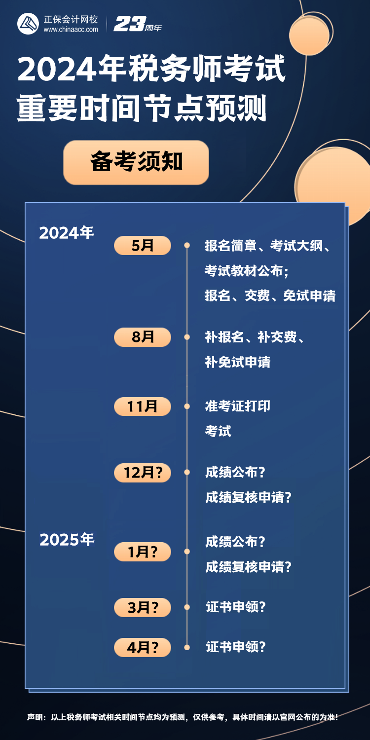 有些同學想要報考2024年的稅務師,有些同學還是頭一回備考,不太了解稅務師考試相關的時間節(jié)點。沒關系,看看下面這張圖,讓自己心里有譜兒!