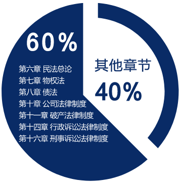 第六章 民法總論;第七章 物權法;第八章 債法;第十章 公司法律制度;第十一章 破產法律制度;第十四章 行政訴訟法律制度;第十六章 刑事訴訟法律制度分值占比: