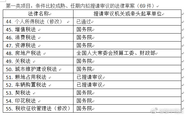 據悉,十三屆全國人大常委會公布了三類立法規劃。其中,第一類立法項目69項,屬于“條件比較成熟、任期內擬提請審議”的立法項目。幾項和稅收相關的立法規劃全部屬于此類條件已比較成熟、任期內擬提請審議的法律草案。結合此前“在2020年前全面落實稅收法定原則”的要求,剩余尚未立法的稅種,在此次立法規劃中都有所體現。