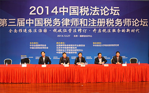 2014中國稅法論壇暨第三屆中國稅務律師和注冊稅務師論壇于2014年12月27日在北京國家會議中心舉行。由中華全國律師協會和中國注冊稅務師協會聯合主辦的本次論壇的主題是:全面推進依法治國和依法治稅,推動稅收征管法修訂和加快社會組織立法進程,進一步拓展涉稅服務領域,更好地發揮注冊稅務師、稅務律師等專業服務機構在財稅法治社會建設,推進國家法治治理體系和治理能力現代化方面的重要作用。來自全國人大、財政部、國家稅務總局、行業協會、高等院校、律師事務所、稅務師事務所、企業等單位的專家、學者,共計350余人參加了本次論壇。