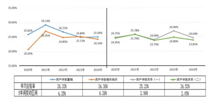 2024年資產評估師考試4個科目平均合格率為24.43%,比2023年減少1.01%。5年間,《資產評估基礎》《資產評估相關知識》單科合格率呈波動狀態,《資產評估實務(一)》《資產評估實務(二)》單科合格率總體趨于平穩。《資產評估基礎》科目的年均合格率相對最高,為26.32%,《資產評估相關知識》科目的年均合格率相對最低,為24.36%。