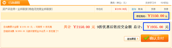 初次來到網校,正小保計劃報名資產評估師特色無憂班全科聯報輔導課程,總價值2150元,正小保因為具有了銀卡會員資質,享受到了9折優惠,折后價格竟然只有1935元,便宜二百多塊呢好不好!