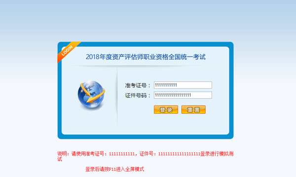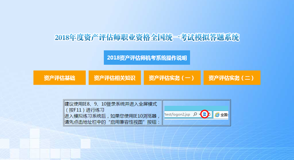 為方便廣大考生熟悉機(jī)考環(huán)境和電子化試題形式,中國(guó)資產(chǎn)評(píng)估協(xié)會(huì)已開(kāi)通資產(chǎn)評(píng)估師資格全國(guó)統(tǒng)一考試機(jī)考練習(xí)系統(tǒng)。考生可以直接登錄進(jìn)行在線練習(xí)。請(qǐng)使用IE8、9、10或其他最新版瀏覽器,登錄系統(tǒng)后進(jìn)入全屏模式(按F11)進(jìn)行練習(xí)。