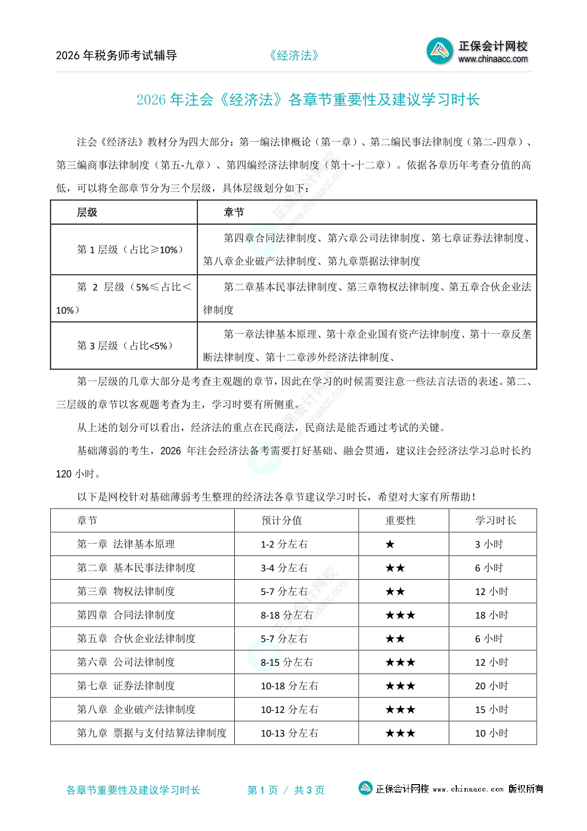 2026年注會《經(jīng)濟法》各章節(jié)重要性及建議學習時長
