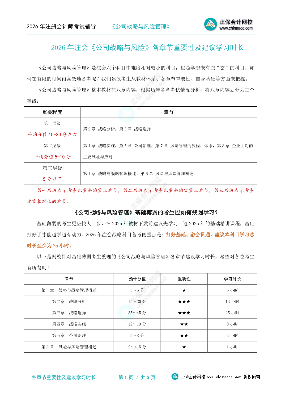 2026年注會(huì)《公司戰(zhàn)略與風(fēng)險(xiǎn)管理》各章節(jié)重要性及建議學(xué)習(xí)時(shí)長