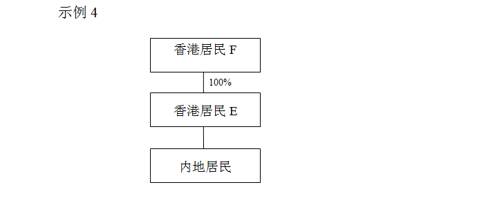 示例4投資架構,為本條第一款第(一)項規定的情形,香港居民E投資內地居民并取得股息,香港居民F直接持有香港居民E100%的股份,雖然香港居民E不符合“受益所有人”條件,但是,如果香港居民F符合“受益所有人”條件,應認為香港居民E具有“受益所有人”身份;