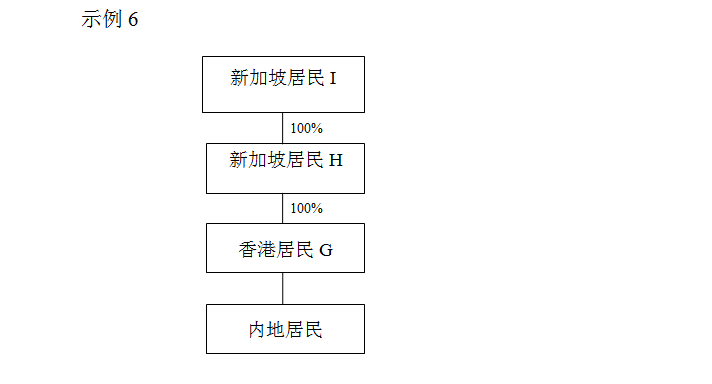 示例6投資架構,為本條第一款第(二)項規定的情形,香港居民G投資內地居民并取得股息,新加坡居民I通過新加坡居民H間接持有香港居民G100%的股份,雖然香港居民G不符合“受益所有人”條件,但是,如果新加坡居民I符合“受益所有人”條件,并且新加坡居民I和新加坡居民H從中國取得的所得為股息時,根據中國與新加坡簽署的稅收協定可享受的稅收協定待遇均和香港居民G可享受的稅收協定待遇相同,應認為香港居民G具有“受益所有人”身份,香港居民G可根據內地與香港簽署的稅收安排享受稅收協定待遇。
