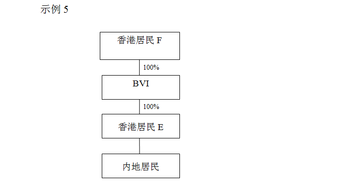 示例5投資架構,為本條第一款第(一)項規定的情形,香港居民E投資內地居民并取得股息,香港居民F通過在BVI注冊成立的公司(不論該公司是否為香港居民)間接持有香港居民E100%的股份,雖然香港居民E不符合“受益所有人”條件,但是,如果香港居民F符合“受益所有人”條件,應認為香港居民E具有“受益所有人”身份;
